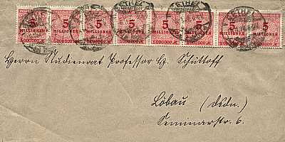 Inland printed matter (26-50 g) from 04.11.1923 franked with 8 stamps a 5 Million Mark (=40 Million Mark)