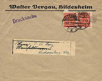 Inland printed matter (1-25 g) from 03.11.1923 franked with 2 stamps a 10 Million Mark (=20 Million Mark)
