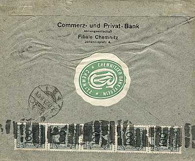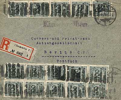 Inlandsbrief mit Einschreiben (1-20 g) vom 10.11.1923 frankiert mit 4 Marken a 500 Millionen Mark (=2 Milliarden Mark, 1 Milliarde Brief 1 Milliarde Einschreiben) |