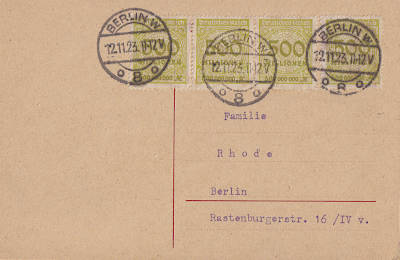 Local postcard from 12.11.1923 franked with 4 stamps a 500 Million Mark (=2 Billion Mark)