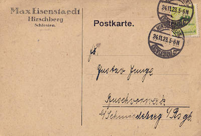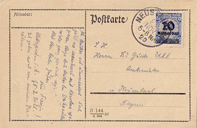 Inland postcard from 23.11.1923 franked with one stamp a 10 Billion Mark on 20 Million Mark (=10 Billion Mark)