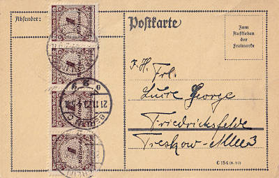OLocal postcard from 21.11.1923 franked with 4 stamps a 1 Billion Mark (=4 Billion Mark)