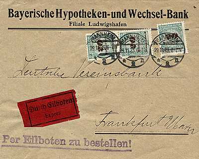 Inland cover with special delivery (1-20 g) from 29.11.1923 franked with 3 stamps a 20 Billion Mark (=240 Billion Mark, 80 Billion cover 160 Billion special delivery) |