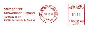 Einkreisstempel mit Steg-segment oben mit fünf-stelliger Postleitzahl in rotoder blau