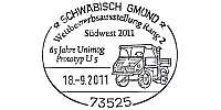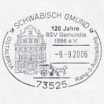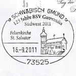 Ellipsenstempel mit 2 Striche (2bo4zbu) "SCHWÄBISCH GMÜND/ 125 Jahre BSV Gamundia/ Südwest 2011/