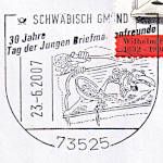 Wappen mit Kurzsteg und Sehne (5z) "SCHWÄBISCH GMÜND/ 30 Jahre/ Tag der Jungen Briefmarkenfreunde/ (Datum)/ (Bild)/ 73525"
