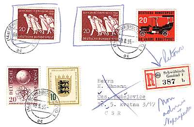 Einschreibebrief in die CSSR mit blau umrandete Briefmarken und handschriftlichem Vermerk "Retour" der tschechischen Post