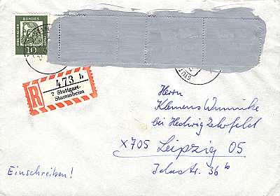 Einschreibebrief in die DDR mit von der DDR-Post grau übermalten Briefmarken