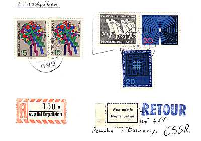 Einschreibebrief in die CSSR mit grau markierter Briefmarke und "Retour"-Stempel der tschechischen Post