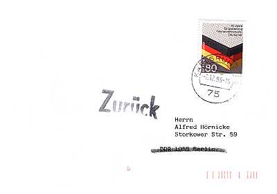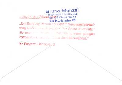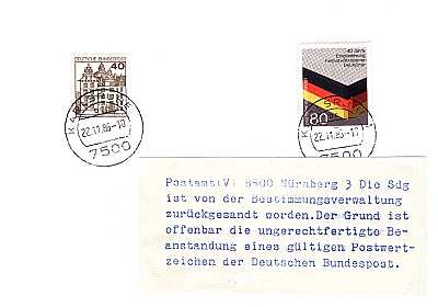 Brief in die CSSR mit "Retour"-Stempel der tschechischen Post (verdeckt) und sechszeiligen Hinweiszettel der westdeutschen Post |