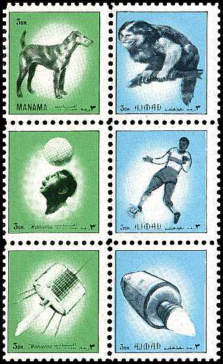 Bogen mit 25 Briefmarken von Ajman (rechts) und 25 Briefmarken von Manama (links)