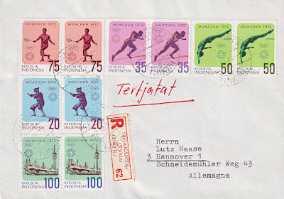 Auslandsbrief mit Einschreiben frankiert mit10 Marken Olympische Sommerspiele München