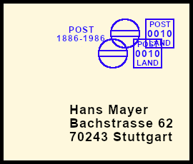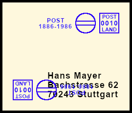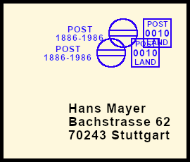 rückseitiger Freistempel: Postsendung die durch eine Fehlleistung mit einem Freistempel auf der Rückseite versehen wurde |