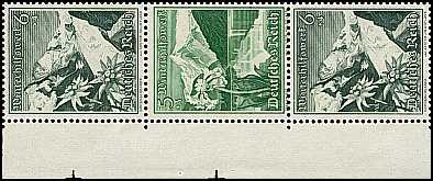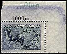 zweifarbige Briefmarke mit Anlagemarke "Oben" für das richtige Anlegen des Bogens mit grünem Unterdruck für den Bilddruck |