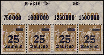 Aufdruck-Hausauftragsnummer: fortlaufende Auftragsnummer auf einem Bogenrand bei einer Briefmarke mit Aufdruck der sich auf den Aufdruck bezieht |