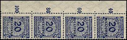 Klischeenummer: fortlaufende Nummern auf dem linken Bogenrand bei Briefmarken die im Walzendruck hergestellt wurden (Gruppenpaarnummer) |