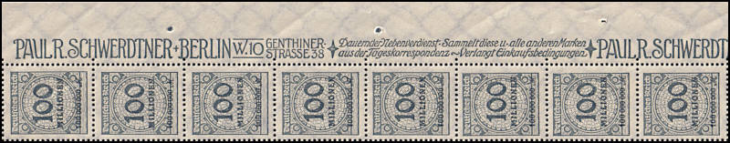 Reihenwertzähler: abrechnungstech- nisches Hilfsmittel auf einem Bogenrand das den Verkaufswert der vollständigen senkrechten Markenreihen angibt |