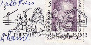 Christkindlhandstempel: jährlicher Ent-wertungsstempel der Gemeinde Christkindl bei Steyr mit weihnachtlichem Motiv der von Ende November bis zum 6.1. des Folgejahrs eingesetzt wird |