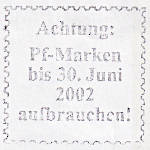 nachträglich entwertet Maschinenstem-pel: Entwertungsstempel einer Postfiliale mit der versehentlich nicht entwertete Post-wertzeichen nachträglich gestempelt wurden |