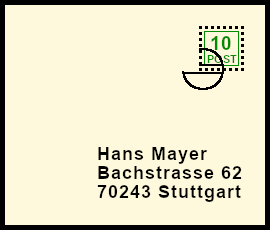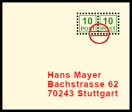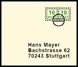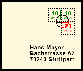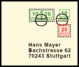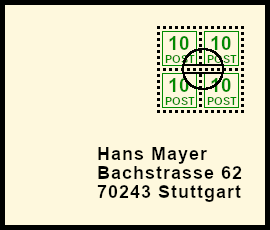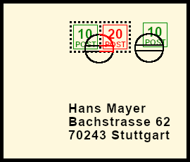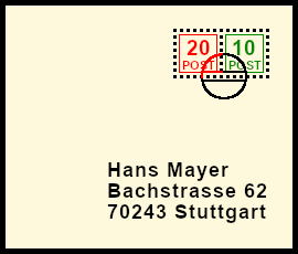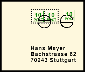 falsche Frankatur: betrĂ¼gerische Nachahmung einer Frankatur mit echten gestempelten Briefmarken aber falscher Zusammenstellung |