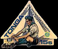 zeltförmige Briefmarke: Marke in Form eines Zelts mit einem Pfadfinder davor |