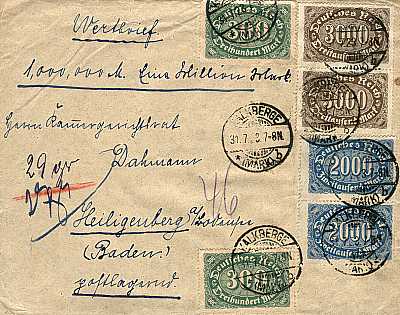Inlandsbrief mit Wertangabe frankiert mit 6 Briefmarken mit gleichem Bilddruck in 3 unterschiedlichen Farben |
