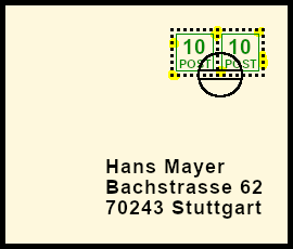 Frankatur mit falschem Handstempel: Postsendung mit einer echten Frankatur die in betrügerischer Absicht mit einem falschen Handstempel versehen wurde |