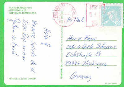 Überfrankatur: Freimachung einer Post-sendung die in ihrer Höhe über das erforder-liche Entgelt hinausgeht (z. B. 5 Mark anstatt 4 Mark) |