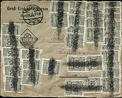 Massenfrankatur: Postsendung frankiert mit einer Vielzahl von Briefmarken infolge Fehlens geeigneter hoher Wertstufen oder als philatelistische Spielerei |