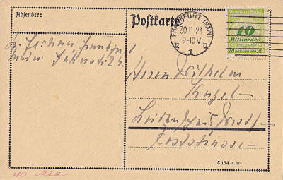 Vierfachaufwertung: Postsendung aus dem Deutschen Reich zwischen 26. - 30.11.1923 bei der die Briefmarke zum vierfachen Nenn-wert verwendet wurde (z. B. Postkarte 40 Milliarden Mark) |