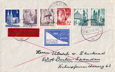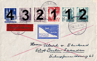 Inland cover with special delivery and airmail franked with postage stamps from 4 postal areas: 1 Baden, 2 Rhineland-Palatinate, 3 Wurttemberg and 4 Allied Occupation