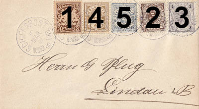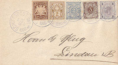 Inland cover franked with postage stamps from 5 postal areas: 1 Bavaria, 2 German Empire, 3 Austria, 4 Switzerland and 5 Wurttemberg