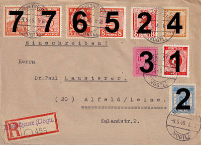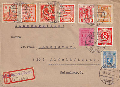Inland cover with registeration franked with postage stamps from 7 postal areas: 1 Allied Occupation, 2 Berlin and Brandenburg, 3 Mecklenburg-Western Pomerania,