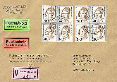Auslandspostsendung Sonderpost-gebühr: Postsendung im grenzüberschreit-enden Verkehr die zu einer reduzierten Auslandspostgebühr befördert wurde (z. B. 1,80 anstatt 2,40 Mark) |