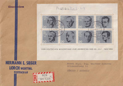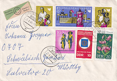 Absenderfreimachungsvermerk: Vermerk auf einer von einem Absender frankiert ein-gelieferten Postsendungen bei der die Über-frankatur nicht von der Post zu verantworten ist (5 DM anstatt 4 DM) |