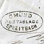 Postablagehandstempel: Nebenstempel einer Postablage mit Angabe des Ein-lieferungsorts und der übergeordneten Postfiliale |