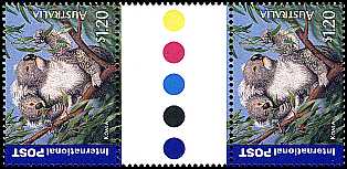 Zwischensteg mit Farbkennung: Einheit bei der als beabsichtigte Ausführung die außen liegenden Bogenfelder mit einem Briefmarkenbilddruck und das Bogenfeld in der Mitte mit einer Farbkennung versehen wurde |
