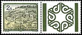 Zusammendruck Briefmarkenbilddruck mit Zierfeld: Einheit bei der als beab-sichtigte Ausführung ein Bogenfeld mit einem Briefmarkenbilddruck und das andere mit einem Zierfeld bedruckt wurde |