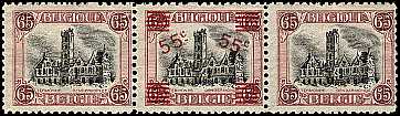 gezähnter Dreierstreifen mit Durchstich zwischen den Briefmarken: Dreierstreifen mit Zähnung der als beabsichtigte Aus-führung zwischen den Briefmarken mit einem Durchstich versehen wurde |