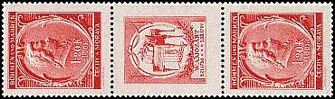 Zwischensteg mit Reklamefeld: Einheit bei der als beabsichtigte Ausführung die außen liegenden Bogenfelder mit einem Briefmarkenbilddruck und das Bogenfeld in der Mitte mit Werbung versehen wurde |