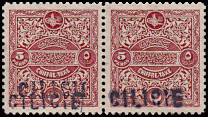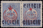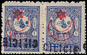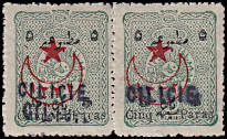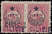 Zusammendruck mit einfachem und doppeltem Briefmarkenaufdruck: Einheit bei der als beabsichtigte Ausführung eine Briefmarke mit einem einfachen und die andere mit einem zweifachen Briefmarken-aufdruck versehen wurde |