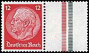 gezähnter Briefmarkenbilddruck mit Zierfeld ohne Trennungshilfe zwischen den Bogenfelder: Zweierstreifen Bilddruck mit Zierfeld mit Zähnung die als beabsicht-igte Ausführung zwischen den Bogenfelder mit keiner Trennungshilfe versehen wurde |