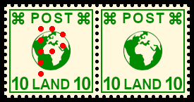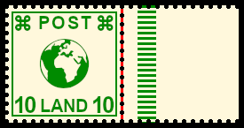 falscher Zusammendruck mit entfernter Zähnung zwischen den Briefmarken: zwei einzelne echte Briefmarken bei denen in betrügerischer Absicht die Zähnung teilweise abgeschnitten wurde um sie dann miteinander zu verbinden |