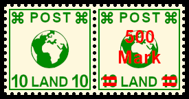 Zusammendruck mit falschem stehendem und kopfsteh-endem Briefmarkenaufdruck: echter Zusammendruck bei dem in betrügerischer Absicht eine Brief-marke mit einem stehenden und die andere mit einem kopfsteh-enden falschen Briefmarkenauf-druck versehen wurde |